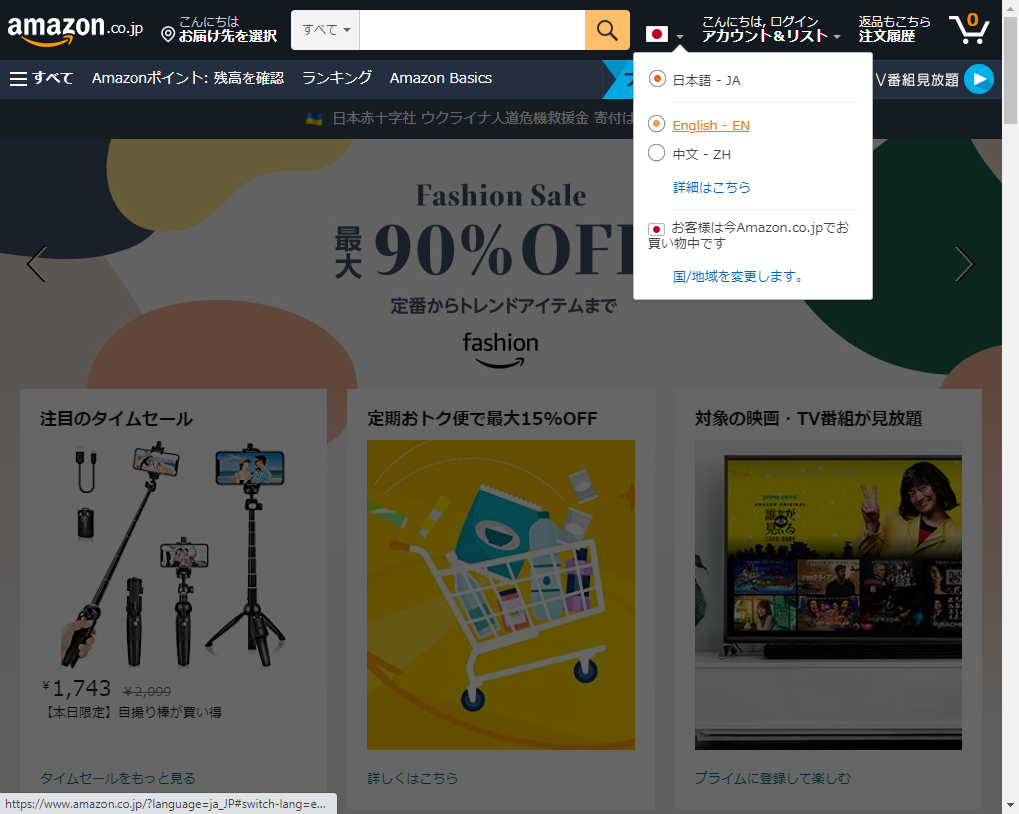 일본 아마존은 영어서비스도 하기 때문에, 꼭 일본어가 아니더라도 상품 구매시 크게 어려운 점은 없습니다. 아니면, 웹 브라우저의 번역 기능을 사용하셔도 됩니다. 아마존에서 제공하는 영어 서비스를 이용할려면, 다음과 같이 영어로 변경해줍니다.