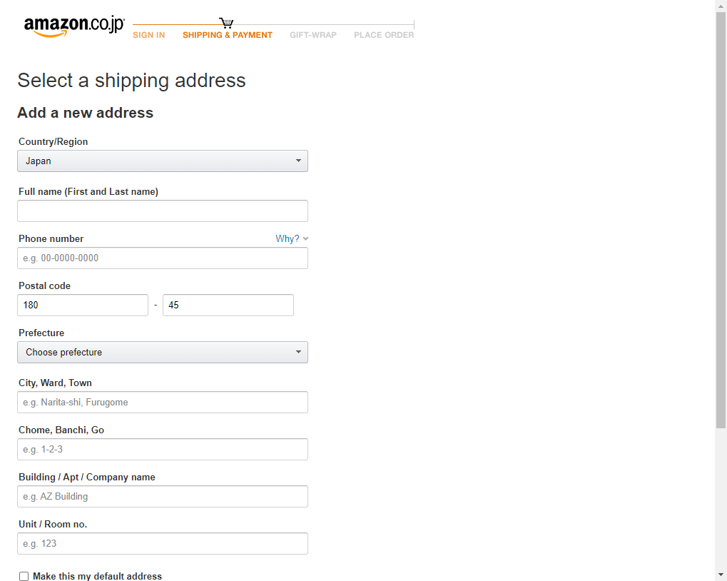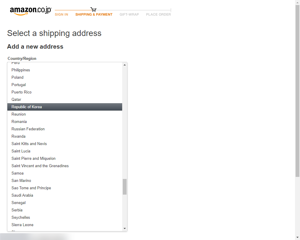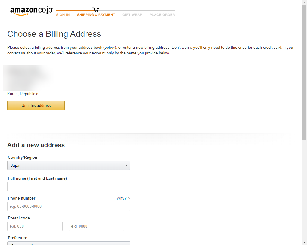 첫 구매시, 배송받을 주소를 영어로 입력합니다. 영문주소는 우체국 우편번호검색 에서 찾아볼 수 있습니다.