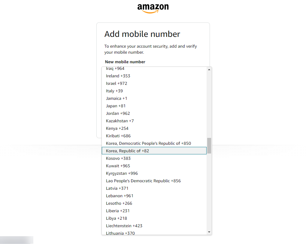 국가는 "Korea, Republic of +82" 를 선택하시면 됩니다.